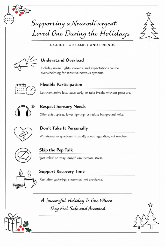 Holidays are often described as a time of joy, connection, and celebration. For many families, they come with traditions, expectations, and emotional meaning. But for people with neurodivergent nervous systems – whether innate or acquired – the holidays can also be deeply taxing.